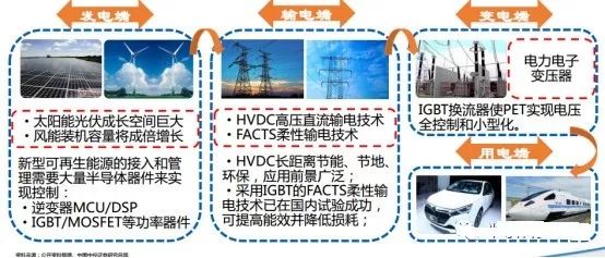 IGBT广泛应用于智能电网的发电端、输电端、变电端及用电端: