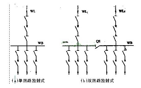 放射式接线是指从变电所母线向各用户分别引出专用线路,直接向用户供电,线路上不连接其他用电设备。放射式接线的优点是供电线路相互独立,线路运行互不影响,任一线路发生故障时,都不影响其他线路的正常运行,操作维护方便;继电保护简单,易于实现自动化。缺点是电源出线回路多,设备用量大,投资大。放射式可分为单回路放射式和双回路放射式两种形式,如图1所示。单回路放射式接线只有一个电源,供电可靠性低;双回路放射式接线有两个电源,供电可靠性高。双回路放射式接线中的母线分段隔离开关QS也可换成断路器,以实现自动切换,提高供电可靠性。