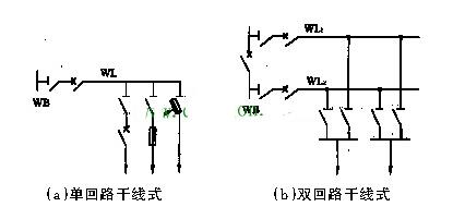 干线式接线是指从变电所母线引出一回供电干线,沿着干线分接一般不超过5个用户。干线式接线的优点是电源出线回路少,供电线路总长度短,有色金属和配电设备的用量较少,投资较小。缺点是供电可靠性不高,干线故障或检修将导致全部用户断电。干线式可分为单回路干线式和双回路干线式两种形式,如图2所示。双回路干线式有两路电源互为备用,其可靠性高于单回路干线式。