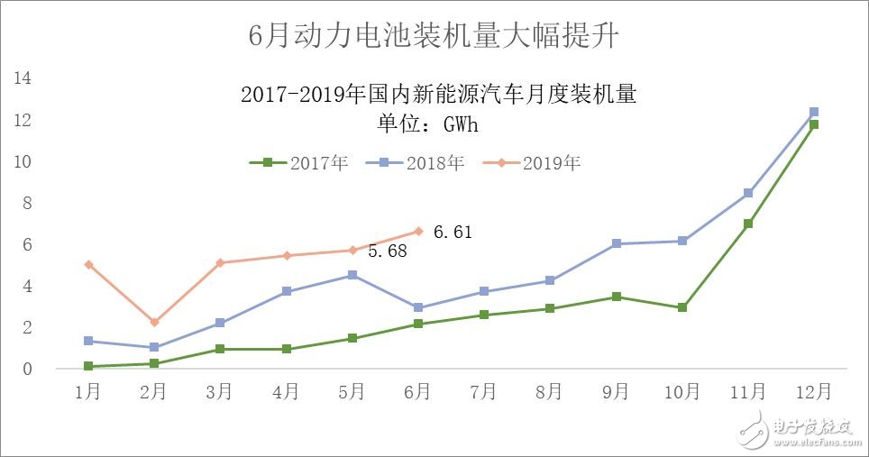 6月份数据相较于5月份,环比增长幅度较大,这一方面是补贴退坡前抢装,另一方面是去年新政实施日期是6月12日,退坡效应当月实际发生,而今年的新政实施日是6月26日,退坡效应实际发生应当在7月。这也导致6月份动力电池装机量相对大幅增长。