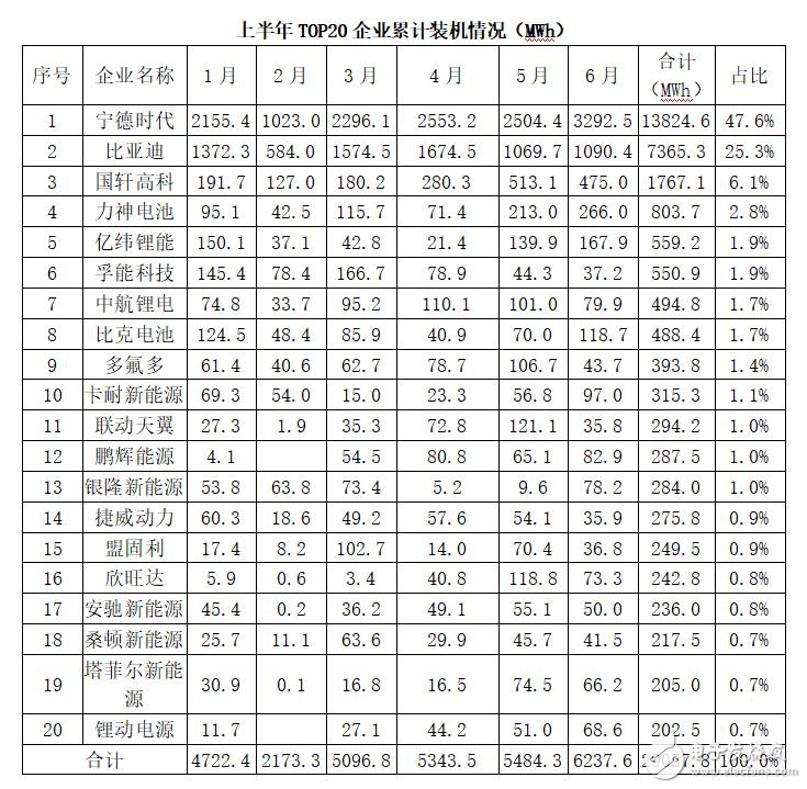 上半年,累计装机量超过1GWh的企业仅有3家:宁德时代以累计装机13.82GWh,比亚迪和国轩高科以7.37GWh和1.77GWh分列第2、3名。