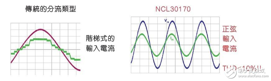 新组件用一种特有的方法来调节电流,而不是用于传统DACD方案的线性方法。电压触发点保持不变,但以此种方式调节电流使其不再是一个阶梯形状,因而产生平滑的正弦波电流(sinusoidal current)(图4右),导致低于10%的极佳THD水平。