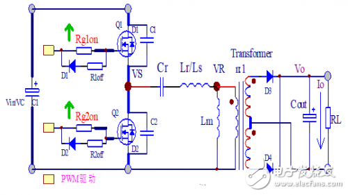 3. 谐振变换器采用频率控制,上下管的占空比各近似为50%.电路工作没有偶次谐波分量,有好的EMI特性。