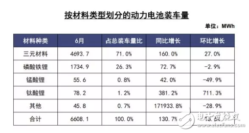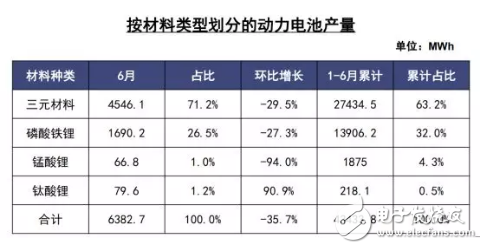 从2019年6月动力电池产量数据来看,我国动力电池产量共计6.4GWh,环比下降35.7%。其中三元电池产量4.5GWh,环比下降29.5%,占总产量比71.2%;磷酸铁锂电池产量1.7GWh,环比下降27.3%,占总产量比26.5%。