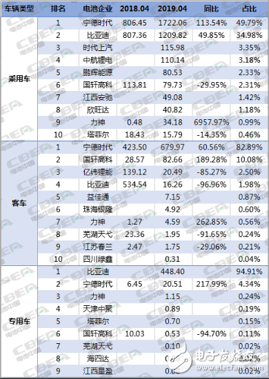 2019年4月各车型配套方型电芯企业TOP10 单位:MWh
