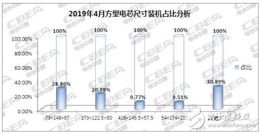 从方型电芯尺寸来看,4月主要以148×79×97和173×125.2×50(单位:mm)这两款尺寸为主,市场占有率之和达50%。其中,148×79×97电芯由宁德时代和时代上汽两家企业提供,173×125.2×50电芯由比亚迪提供。