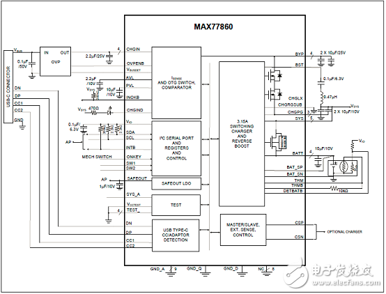 Maxim公司的MAX77860是USB Type-C 3A开关模式降压充电器,集成了CC检测和BC1.2检测和ADC.该充电器集成了两个开关,使用小型电感和电容尺寸,可编程充电电流,非常适合用在手持设备如智能手机,IoT设备和其它锂电池电子设备。充电器具有单输入,可工作于USB和高压适配器。支持BC 1.2标准下的USB Type-C CC检测,芯片还集成了电源通路开关,USB-OTG输出提供真负载断开功能,并可调整输出电流限制,而输入电流限制高达4.0A,单电池充电电流高达3.15A;当配置在反向升压模式,器件就不需要另外电感器。高达14V保护,充电器具有D+/D-充电检测,CC,CV和芯片温度控制,主-从充电功能,高达6A充电电流,支持USB-OTG反向升压,高达1.5A电流限制。本文介绍了MAX77860主要优势和特性,框图和功能框图,典型应用电路图以及评估板MAX77860 EVK主要特性,电路图,建立图和材料清单。