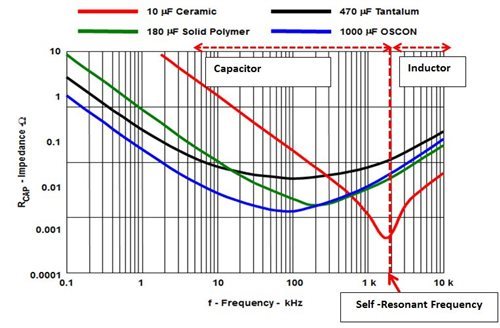 我们可以使用电容组合使阻抗曲线“变平”,以在推高降压转换器的开关频率的同时,使其仍处于电容区域内。电容阻抗因技术和开关频率而异。