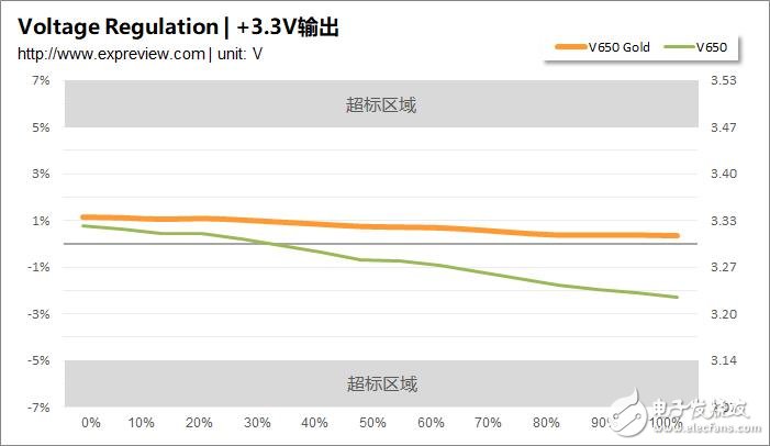 酷冷至尊V650 Gold电源的+12V/+5V+3.3V输出电压相比旧版V650要更为稳定,不仅偏离度更低,调整率也非常低,输出功率的增加并没有带来明显的压降;而旧版V650的+5V与+3.3V在电压稳定性上则表现欠佳,特别是+3.3V的压降相当明显,调整率已经超过3%。