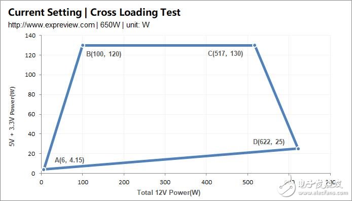 测试点的X坐标表示总的+12V的输出功率,Y坐标表示+5V和+3.3V的输出功率之和,交叉负载的测试与前面的均匀负载测试的评判标准一致。
