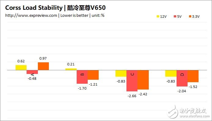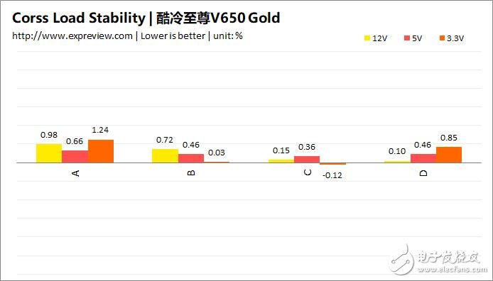 与V650电源相比,酷冷至尊V650 Gold电源在交叉负载(拉偏测试)中的表现要更加优秀,电压偏离度更低,大部分时候都可以将偏离度控制在1%以内,最高时也不过是1.25%;而V650偏离度最高的是+5V,最高是可以达到2.66%的水平。调整率方面也是相同的表现,V650 Gold整体表现让人满意,而V650的+5V与+3.3V则表现欠佳。
