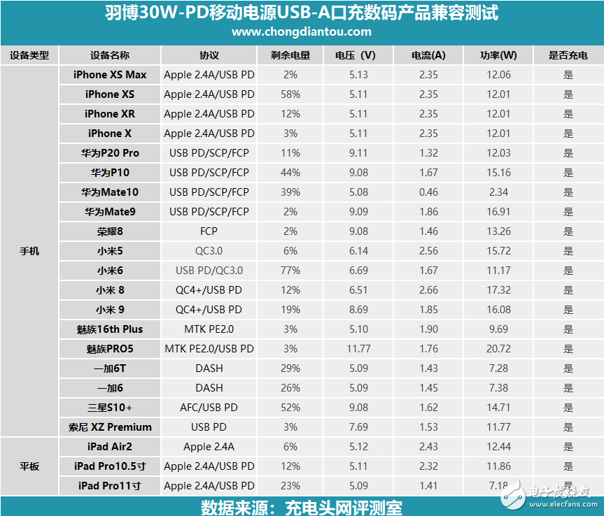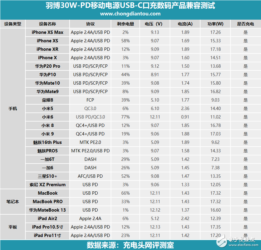 小编还测试了其他设备,做成表格方便大家观看。从图表中可以看出来,支持PD快充的数码产品均能跟羽博移动电源握手PD协议,开启PD快充。一些不支持PD的设备也能正常充电。