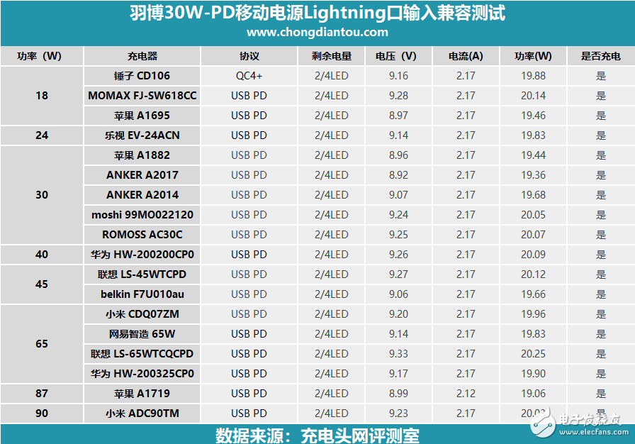 小编把Lightning输入接口的兼容性情况汇聚成表格,可以发现Lightning的兼容性情况也非常好,以上测试的PD充电器均能给它进行快充。