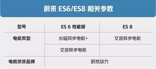 不同于 ES8 全异步感应电机设计,蔚来旗下第二款量产车型 ES6 虽然在基准版中采用了双永磁同步电机的设计,但是其性能版中采用了异步感应电机与永磁同步电机组合的方式,其前轴搭载了 160kW 永磁同步电机,后轴则搭载了 240kW 的异步感应电机,这样的搭配让 ES6 不仅拥有更长的续航里程,同时也兼顾了高性能。