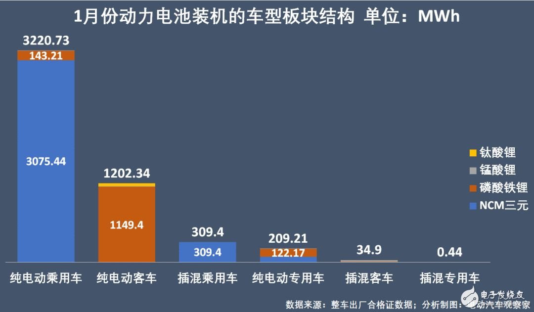 车型领域分布方面,纯电动乘用车是最大的装机市场,1月装机3.22GWh,占比65%,NCM三元材料电池占96%以上。