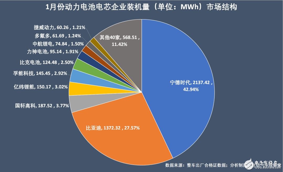 1月份,动力电池装机量最大的电芯企业没有悬念还是宁德时代,装机2.14GWh,市场份额42.9%;比亚迪排名第二,1.37GWh的装机量市场占比为27.6%。两家头部企业合计吃下7成市场。