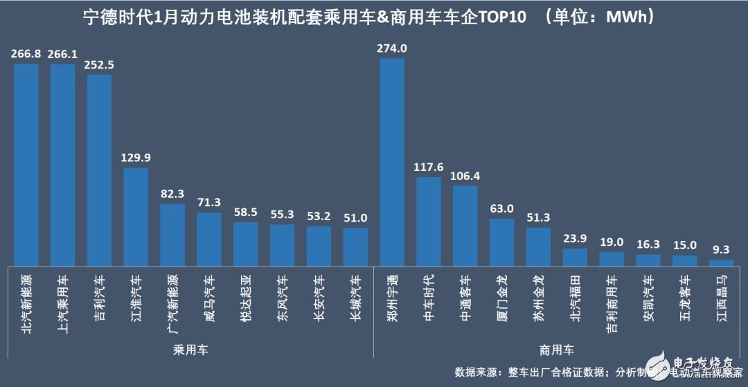 原以磷酸铁锂电池起家的比亚迪,之所以在磷酸铁锂电池市场上也落后于宁德时代,也是因其配套供应车企的关系:比亚迪的磷酸铁锂目前只供应三家车企:一是比亚迪自己旗下的客车和部分乘用车,这是大户;另两个分别是北京华林(也是比亚迪关联公司)和长沙中联重科的纯电动专用车车型,而后者的装机量很少,1月份只有16.3MWh的装机量。