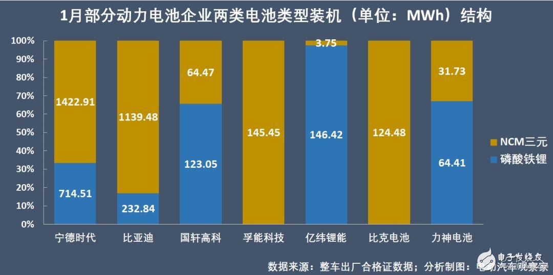 另外的几家领先企业,国轩高科和力神电池则是以磷酸铁锂电池为主,1月的出货比重都超过了60%;另外,孚能科技和比克电池的1月装机动力电池全部是NCM三元材料类型。