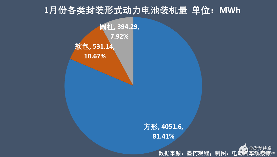 电池形状方面,1月仍以方形电池为主,占比81%,装机量4.05GWh,软包电池占比装机531MWh,占比11%,尚低于去年全年13.45%的平均水平。