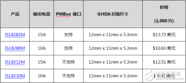 同时推出的另外两款全新的模拟电源模块ISL8210M和ISL8212M,采用了同样管脚兼容的12mm x 11mm封装,分别提供10A和15A输出电流。这些混合数字和模拟电源模块为服务器、存储产品、光网络、电信产品以及各种空间受限的工业应用中使用的高端FPGA、DSP、ASIC和存储器实现负载点(POL)转换。每个模块均在新的、热优化的、栅格高密度阵列(GHDA)封装内集成了PWM控制器、MOSFET及电感。设计者仅需简单添加一些输入输出陶瓷电容,即可完成电源设计。