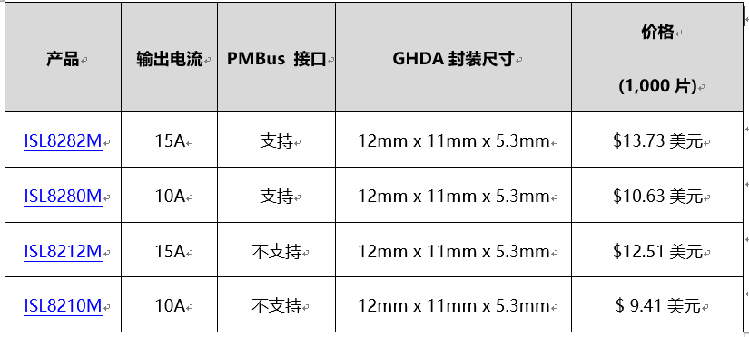 ISL828xM混合数字电源模块和ISL821xM模拟电源模块现已供货,并可从瑞萨电子的全球分销商处购买,相关价格如下表所示: