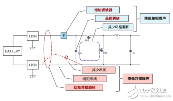 要想降低差模噪声(蓝色),可在电路板上缩小大电流路径的环路面积,并增加最优解耦和输入滤波器。尽可能地抑制噪声的发生源–差模噪声是非常重要的,这也关系到降低共模噪声。