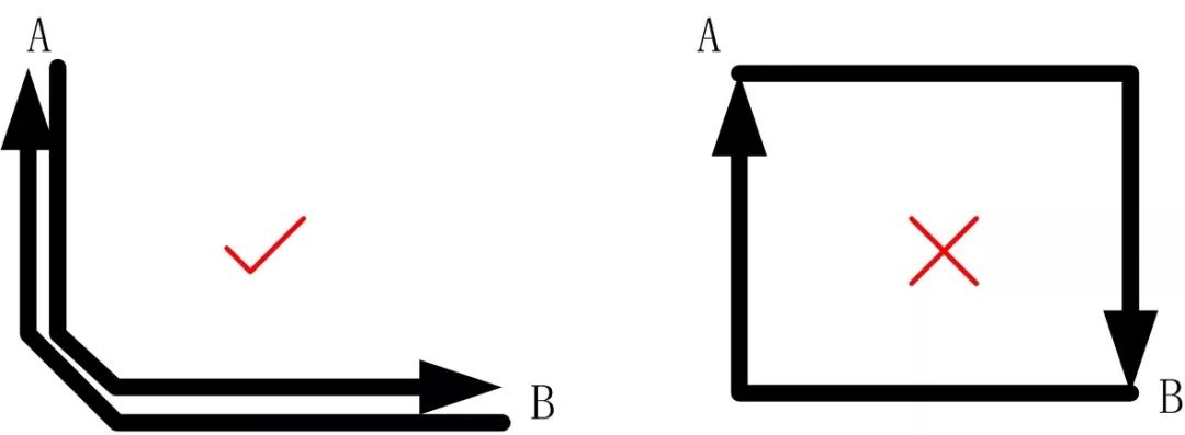 另外若控制线很长,应该将来回的一对线的靠近,或将二者置于PCB的两个面上并正对着,从而减小其环路面积,避免被功率部分的电磁场干扰。如图2说明了A、B两点间,正确与错误的信号线布线方法。