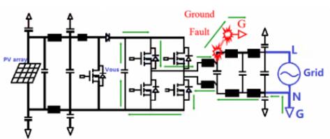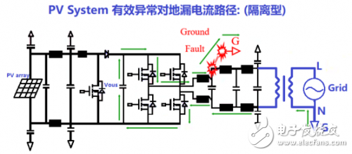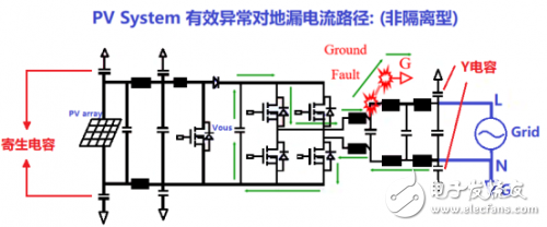 其产生的原理:由于逆变器在高频切换时,部分输出电流会经由EMI Y电容流经PV 组件对大地的寄生电容后,再流回逆变器,因此只要由EMI的Y电容或PV 组件的寄生电容越大,所产生的高频对地漏电流也越大,而逆变器的输出电流被影响的程度,也就越严重。