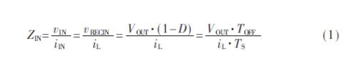 DC-DC开关变换器中传统的PFC控制算法,使得输入的交流电流iIN紧密跟随正弦交流输入电压vIN。在二极管全波整流桥后,Boost PFC变换器检测整流后的正弦交流输入电压vRECIN作为内部电流环路的参考。内部电流环路具有宽带宽,通过PWM控制或变频控制,使得Boost变换器的电感电流iL跟随正弦交流输入电压vRECIN。然而从另一个角度看,如果交流输入端的等效阻抗ZIN为电阻特性,就可以实现PFC[6]。在整个交流工频周期内,CCM工作模式下,虽然每个开关周期内Boost电感没有严格地遵守伏-秒平衡定律,但由于Boost变换器的开关频率通常比交流工频频率高约几百倍,因此这个伏-秒平衡的误差可以忽略不计。因此,在CCM运行模式下,Boost PFC变换器的输入阻抗可以近似地用式(1)表示。