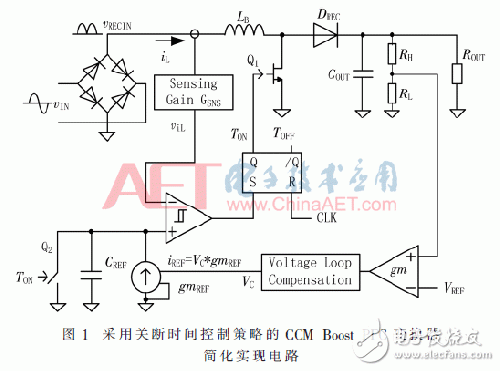 随着我国工业的发展,越来越多的非线性负荷接入电网,各种换流设备的使用,使电网的电压波形发生畸变,造成电能质量下降,威胁电网和各种用电设备的安全、经济运行。为了能够确保电网安全,研制出了各种PFC变换器。在结构方面,Boost结构的应用相当广泛。因此本文便以Boost PFC变换器为基础开展研究。在控制策略方面,峰值电流控制模式[1]和滞环电流控制模式[2]可使Boost电感电流很好地跟随交流输入电压,然而只适用于连续导通模式下(Continuous Conduction Mode,CCM);平均电流控制模式[3]可以在CCM工作模式和在断续导通模式(Discontinuous Conduction Mode,DCM)下使得开关周期的平均电感电流跟随一个正弦参考值,然而在实际应用中,这种内部控制环路的补偿设计比较困难。数字控制技术也普遍用于PFC变换器中,文献[4]-[5]列出了采用集中数字控制技术的Boost PFC变换器的实现方式,无论在CCM工作模式还是在DCM工作模式下,它们都可实现AC-DC功率变换器的单位功率因素校正,但是它也相应地增加了代码编程和系统电路设计的复杂性。而近年兴起的新控制策略中,单周期控制[6-7]是一种简单控制策略,大大简化了PFC变换器的设计。关断时间控制策略便是单周期控制策略中其中一种。当然它也存在模式切换的问题,而传统的关断时间控制策略在模式转变时会有较大的输入电流失真的不足,本文在没有工作模式检测和控制算法改变的情况下,为了能自动地达到单位功率因数校正,为Boost PFC变换器提出了一种改进的关断时间控制策略。该控制策略可以在工作模式转换时及时地调节功率晶体管的关断时间,实验证明该策略能够降低在工作模式转换时的输入电流的失真和提高THD性能。