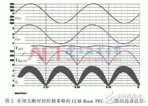 为了实现这种关断时间的控制策略,图1显示了Boost PFC变换器的一种简化电路。二极管整流桥将正弦交流输入电压vIN整流为正的交流电压vRECIN。Sensing Gain SNS电路检测Boost电感电流iL,其中电流检测信号viL的开关纹波可以很容易地被一个很小的RC滤波器滤掉。它连接到比较器的负输入端,作为内部电流环路的参考值,用来调制关断时间。锯齿波发生器由接地的开关Q2、参考电容CREF和电压控制电流源iREF(增益gmREF受反馈回路和补偿回路控制)组成。开关Q2与主开关Q1同相位,所以在Q1关断期间内,锯齿波发生器输出锯齿波电压VSAW。VSAW在Q1关断期间上升,当锯齿波电压VSAW等于电流检测信号viL时,通过R-S触发器打开开关Q1,关断时间结束。固定频率的时钟信号也决定了Q1关断的起始时间和开关频率。外部电压环路是一个闭环,它通过补偿电路的输出VC来成比例地控制电流源iREF。由于电压环路的带宽低,因此VC在半个工频周期内是恒定的。内部电流环路的稳态关系可以用式(2)表示。这意味着Boost电感电流iL与开关关断时间TOFF成正比。在式(1)中代入式(2),输入阻抗ZIN变为式(3)所示的常数值,这意味着获得了单位功率因数校正。图2显示了采用该控制策略的300 W CCM Boost PFC变换器的仿真波形。