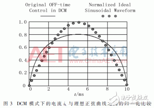 虽然这种关断时间控制策略非常简单,其原理和方法也可以进一步扩展其他PFC拓扑电路,但上述分析的基本假设前提条件,决定了它的限制性:必须工作在CCM模式。随着输出负载电流的减少,Boost PFC变换器会进入DCM模式下工作。因此,在实际应用中,必须面对混合导通模式(Mixed Conduction Mode,MCM)进行分析[11-12]。众所周知,DCM工作模式下Boost变换器的理想转换比VOUT/VIN不仅由占空比D决定,而且由输出负载RLOAD决定。因此式(1)不能直接用于估算输入阻抗,交流输入电流失真变得严重,难以满足电源变换器应用的THD要求。如果Boost PFC变换器在DCM中还采用此关断时间控制策略,则输入电流iL的理论估计可以用式(4)表示。图3示出了DCM模式下的电流iL与理想正弦曲线之间的归一化比较。