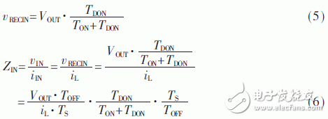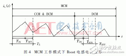 根据上述分析,对于在整个输出负载范围内对THD性能没有严格要求的一些消费电子应用中,使用这种关断时间控制策略是适合的。然而,这种关断时间控制策略明显不能用于电动汽车充电器等工业级应用。为了克服DCM工作模式下的缺点,本文推出了一种改进的关断时间控制策略,它可以在MCM工作模式下,不需要任何工作模式的识别,也不需要任何控制策略的改变。按照前述的想法,为适合于MCM工作模式,电压变换比例方程应该被修正。MCM工作模式下的Boost电感电流波形如图4所示。其中TON是主开关功率管Q1的导通时间,TOFF是主开关功率管Q1的关闭时间,TDON是DCM中的Boost二极管的导通时间。显然,在CCM和边界导通模式(Boundary Conduction Mode,BCM)工作模式下,TDON=TOFF。因此,MCM工作模式下,电压变换比例方程可以用式(5)表示,然后可以推导出输入阻抗式(6)。