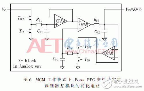 仍然采用如图1所示的关断时间发生电路,把式(2)带入式(6)中,得到式(7)。可以看出,式(7)对于CCM工作模式是有效的,只要TDON=TOFF,它就变为式(3)。其次,为了在MCM工作模式下获得恒定的输入阻抗,最简单的方法是用式(8)中表示的系数K来调制VC。调制后的VCM用来控制电流源IREF以产生关断时间。这就是改进的关断时间控制策略的主要原理,对于MCM工作模式下的Boost PFC变换器,可以实现单位功率因素校正。