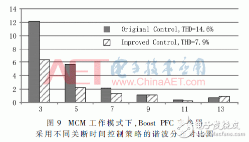 为了在Boost PFC变换器实现该改进的关断时间控制策略,图5显示了其简化电路。调制器K模块用模拟电路方式实现,如图6所示,其中几个小的R-C滤波器用来去除开关频率纹波(请注意,这里如果使用数字方式控制电路可以比模拟电路方式更容易地实现VC调制)。图7显示了Boost PFC变换器在MCM工作模式下,采用改进的关断时间控制策略的仿真波形。图8显示了改进的关断时间控制策略可以大大减小MCM工作模式下输入电流的失真。两种控制策略的谐波分布的比较图如图9所示。采用改进的关断时间控制策略,在MCM工作模式下,THD性能得到了明显的提升。