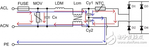 对ACL与ACN之间施加的浪涌电压称为差模浪涌电压,差模路径如图中红线所示;对ACL(或ACN)与PE之间施加的电压称为共模浪涌电压,共模路径如图中蓝线所示。