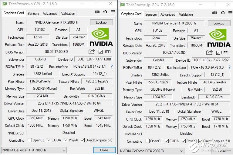 iGame RTX 2080 Ti Vulcan的GPU信息截图,左边的默频BIOS频率较低,仅有1545MHz,TDP也只有250W,比公版还要低10W。