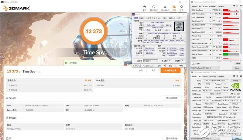 首先是默频,在2K分辨率3DMark Time Spy测试中,iGame RTX 2080 Ti Vulcan图形分数为13674,最高频率1875MHz,核心温度最高67度,风扇转速1680RPM,最大功耗为254W。