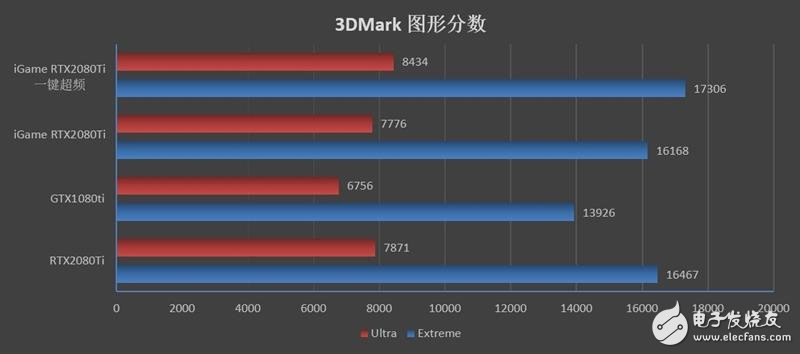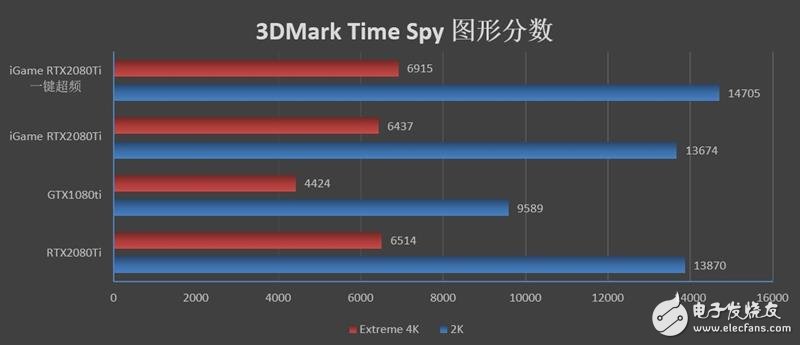 在2K分辨率下,默频的iGame RTX 2080 Ti Vulcan比公版低了100分左右,超频后则能超过公版563分,比GTX 1080 Ti高了1678分。