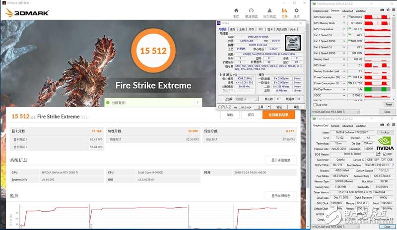 在2K分辨率3DMark Fire Strike Extreme测试中,默频的iGame RTX 2080 Ti Vulcan图形分数为16168,最高运行频率1905MHz,最高温度67度,最大风扇转速1608RPM,最高功耗达到了261W。