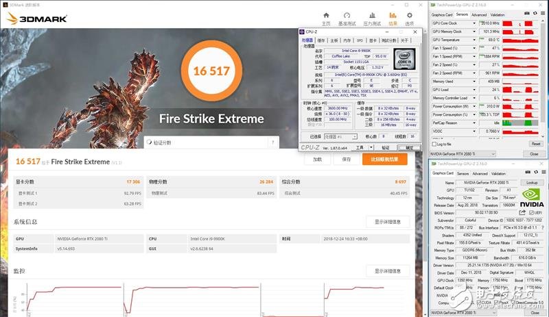 在OC状态下,3DMark Fire Strike Extreme图形分数达到了17306,最高运行频率2010MHz,最高温度69度,风扇转速最高为1884RPM,最高功耗310W。