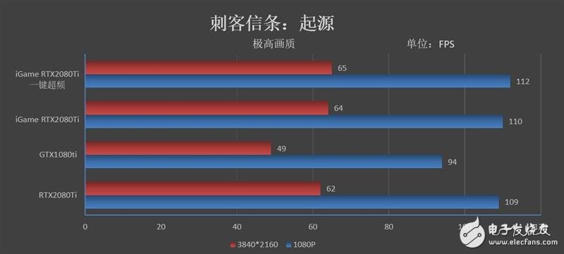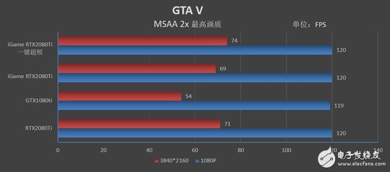 到了4K分辨率下,OC状态下的iGame RTX 2080 Ti Vulcan帧率达到了74FPS,领先公版3FPS,比默频时也提升了5帧。