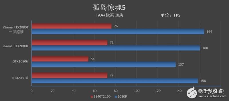 在1080P分辨率下,OC状态下的iGame RTX 2080 Ti Vulcan的帧率为164FPS,领先公版6FPS;到了4K分辨率时,还能够领先4帧。