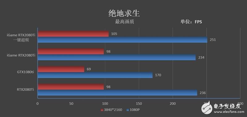 在1080P分辨率下,OC状态下的iGame RTX 2080 Ti Vulcan的帧率为251FPS,领先公版15FPS;到了4K分辨率时,可以领先7帧。