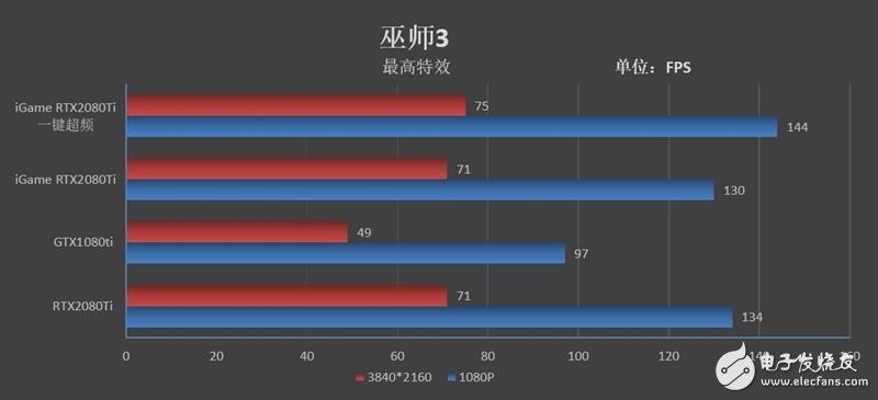 在1080P分辨率下,OC状态下的iGame RTX 2080 Ti Vulcan的帧率为144FPS,领先公版10FPS;到了4K分辨率时,可以领先4帧。