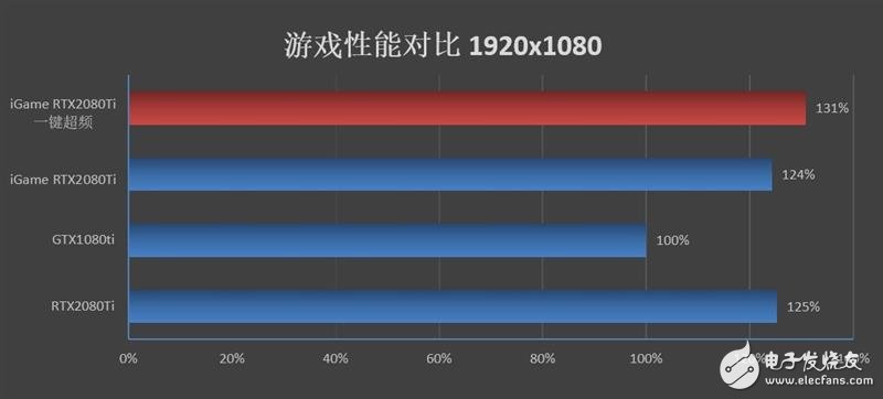 就整体而言,在1080P分辨率下,默频的iGame RTX 2080 Ti Vulcan落后公版1%的样子,但是一键超频后可以反超公版5%,同时能够领先GTX 1080 Ti 31%。