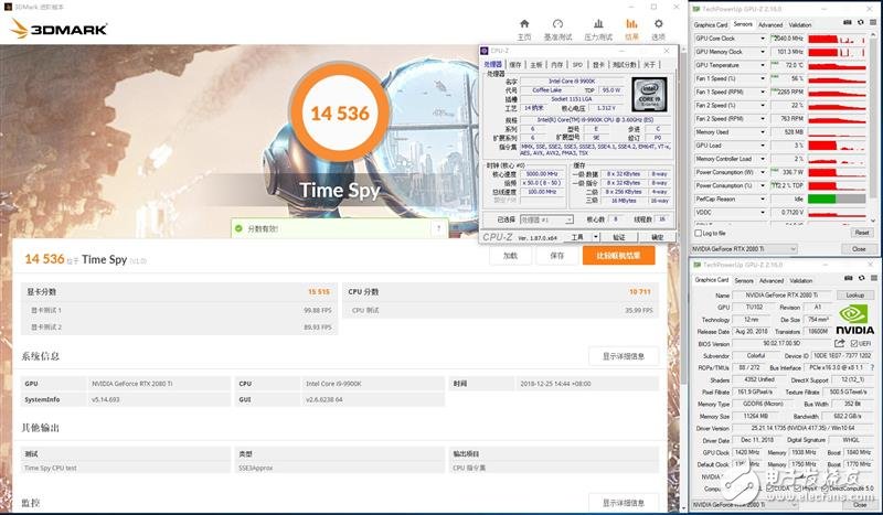 在3DMark Time Spy测试中,手动超频后的iGame RTX 2080 Ti Vulcan TDP图形分数为15515,相比一键超频时的14705提升了4%。最高运行频率为2040MHz,最高温度为72度,风扇最高转速也没有超过2265RPM。