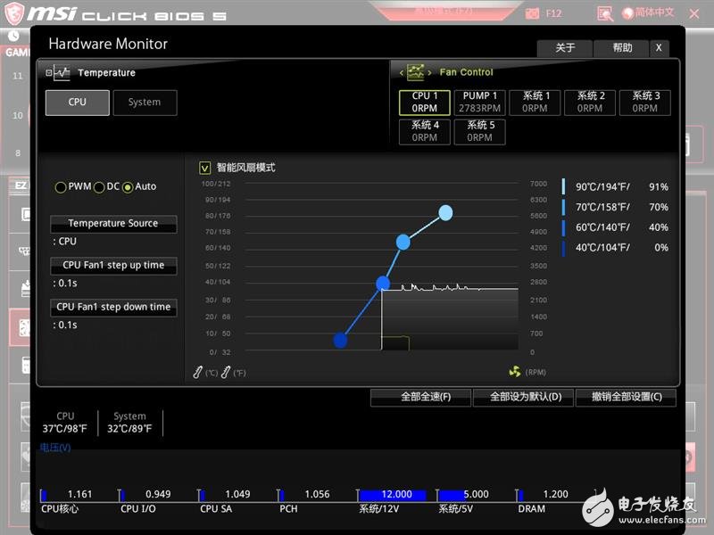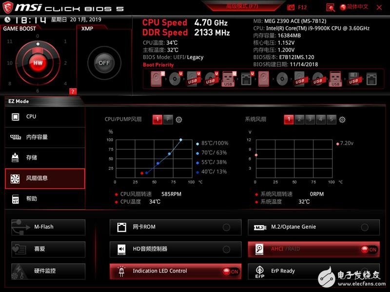 MEG Z390 ACE战神板主板集成了1个4pin CPU风扇、1个4pin水冷风扇和5个4pin机箱风扇接口。7个风扇都可以单独依据CPU、MOS、主板或者机箱内部温度来设置温度曲线。在主界面点“风扇信息”可以进入风扇设置界面。