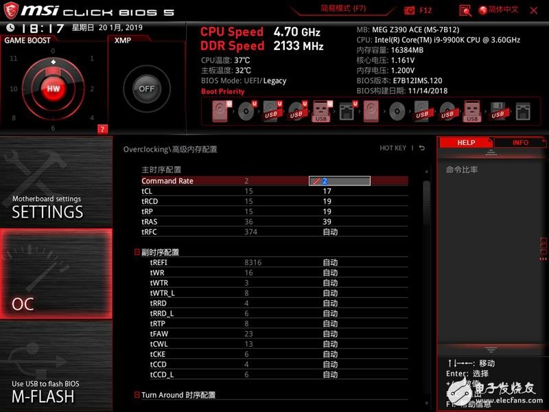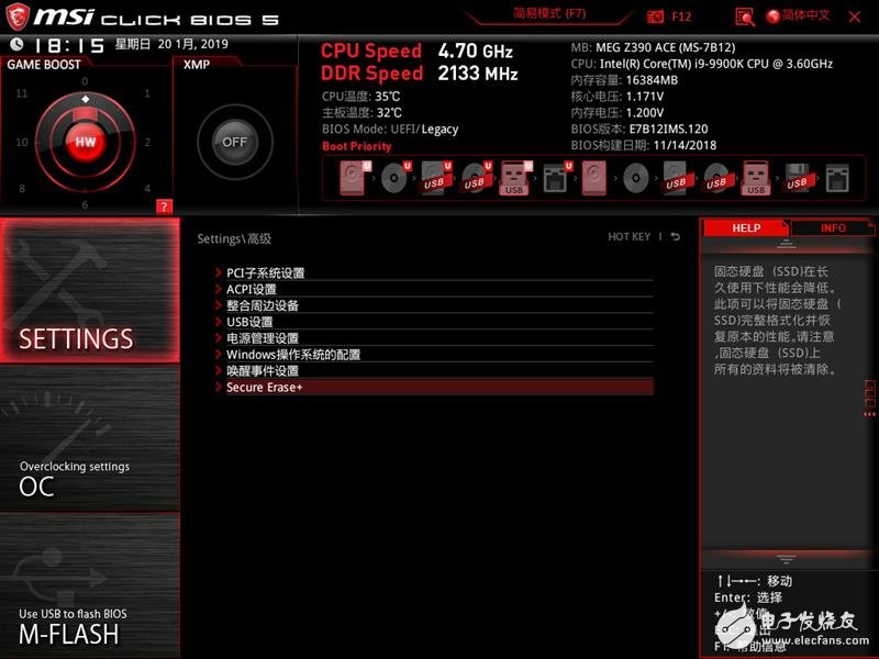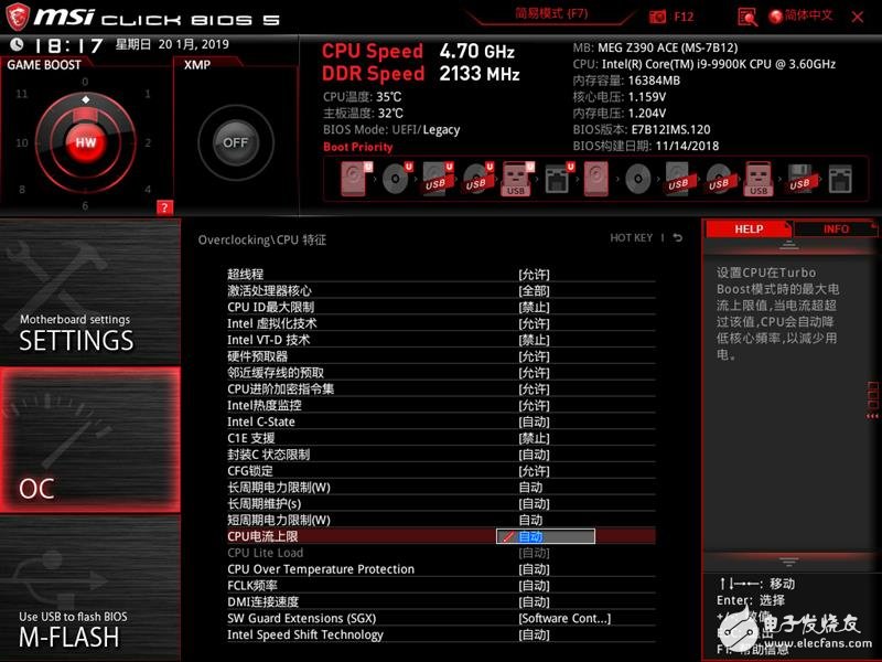 微星MEG Z390 ACE战神板主板同样采用了Click BIOS 5图形化UEFI,主界面包含CPU、内存的频率和电压,CPU以及主板温度等信息。