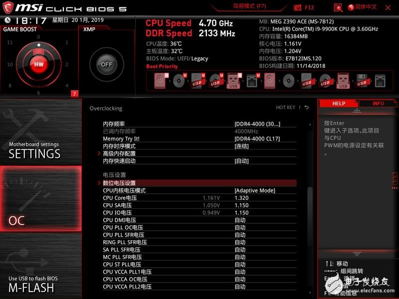MEG Z390 ACE战神板主板的电压设置选项也很丰富,CPU电压、内存控制器电压、Ring电压等等都可以手动设置。
